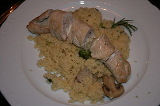 Rolinho de peru recheado com queijo fresco sobre cama de couscous de broculos e cogumelos. Delicioso.